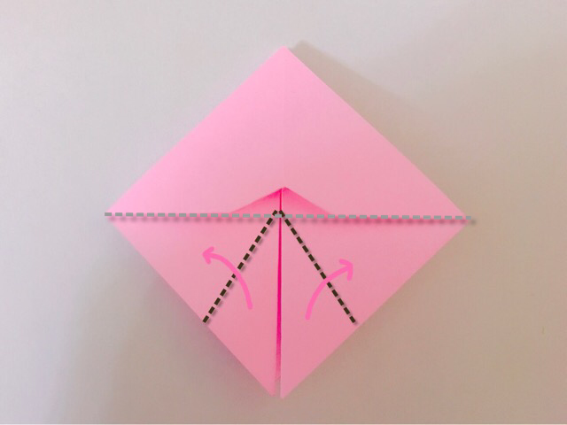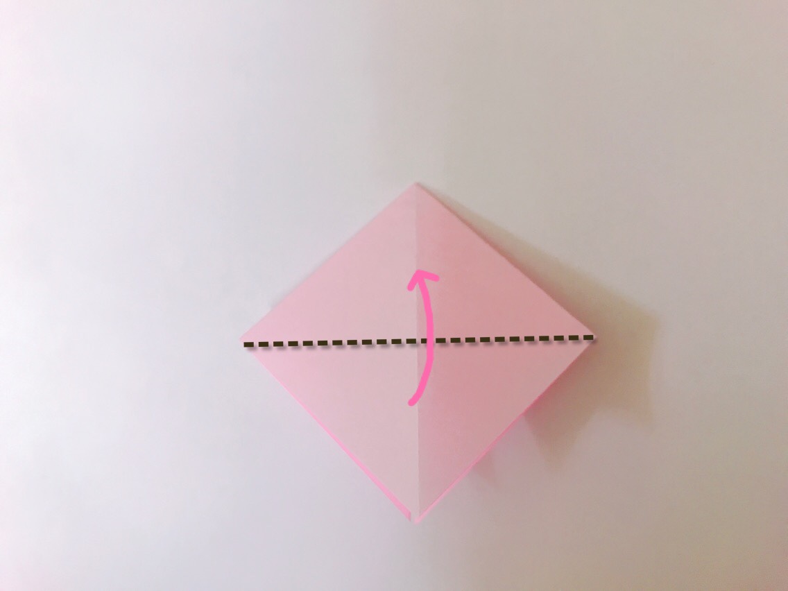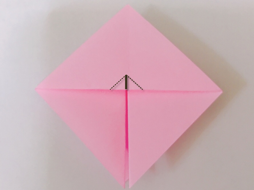 6.点線で折って折り筋をつけます。(角を真ん中に合わせて折ります)