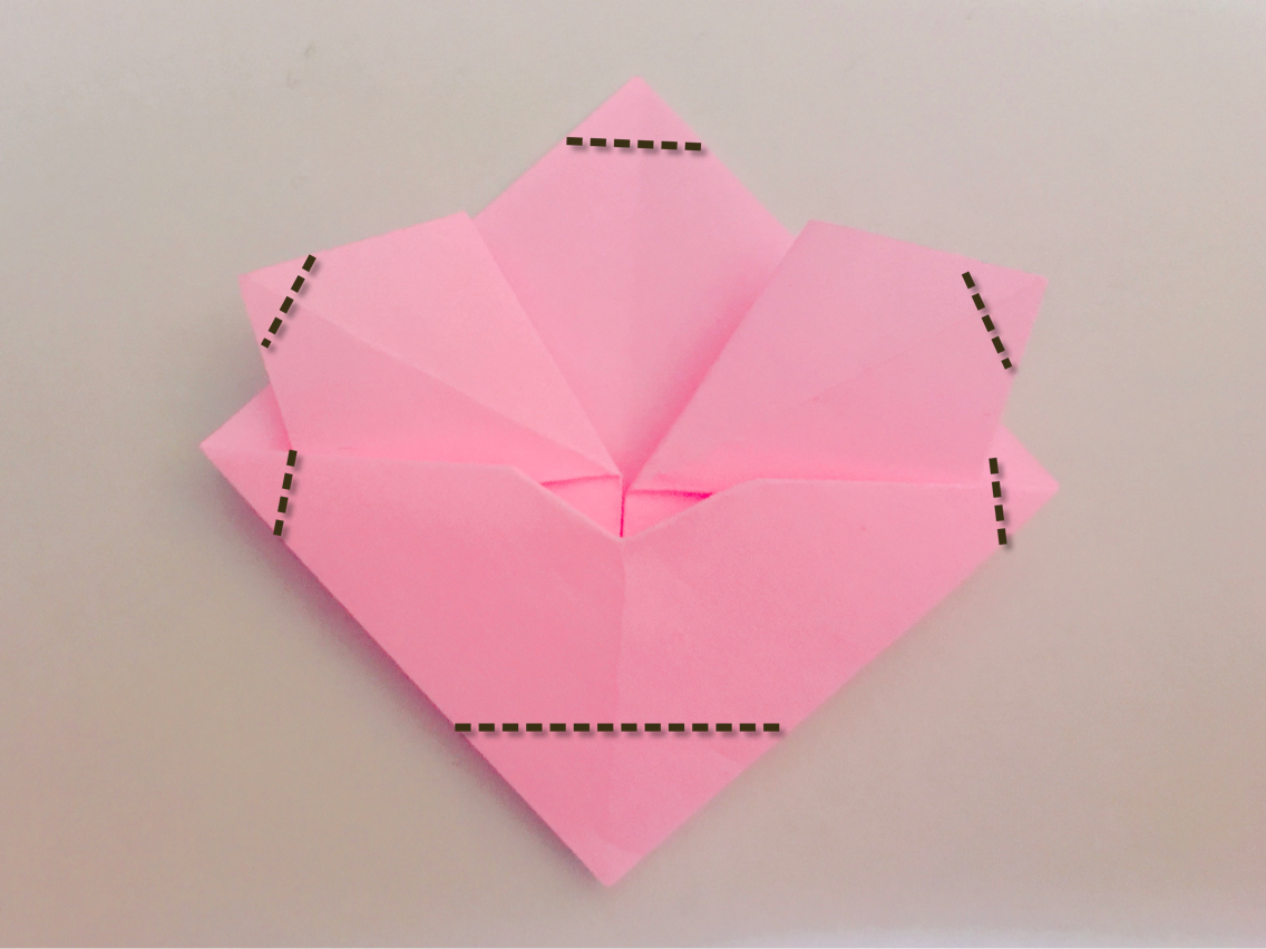 9.点線の部分を山折し花びらに丸みをつけていきます。