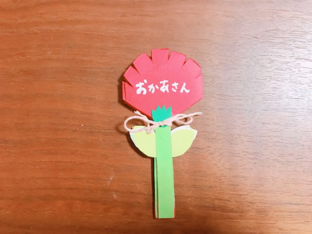 あとは、写真のように画用紙や折り紙で茎と花びらをノリで貼って、カーネーションの母の部分にメッセージを書きます。